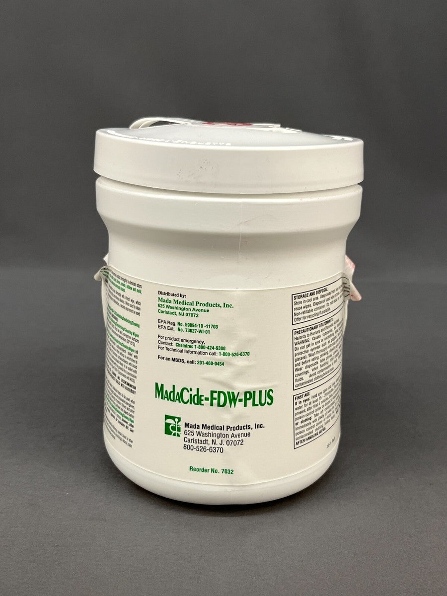 MadaCide-FDW Plus Disinfectant Wipes provide fast, effective cleaning, disinfection, and deodorizing for hard, non-porous surfaces in medical, dental, and general healthcare environments. Each tub contains 160 durable 6" x 7" wipes made from nonwoven, non-abrasive material that safely removes bacteria, viruses, and fungi without damaging equipment.